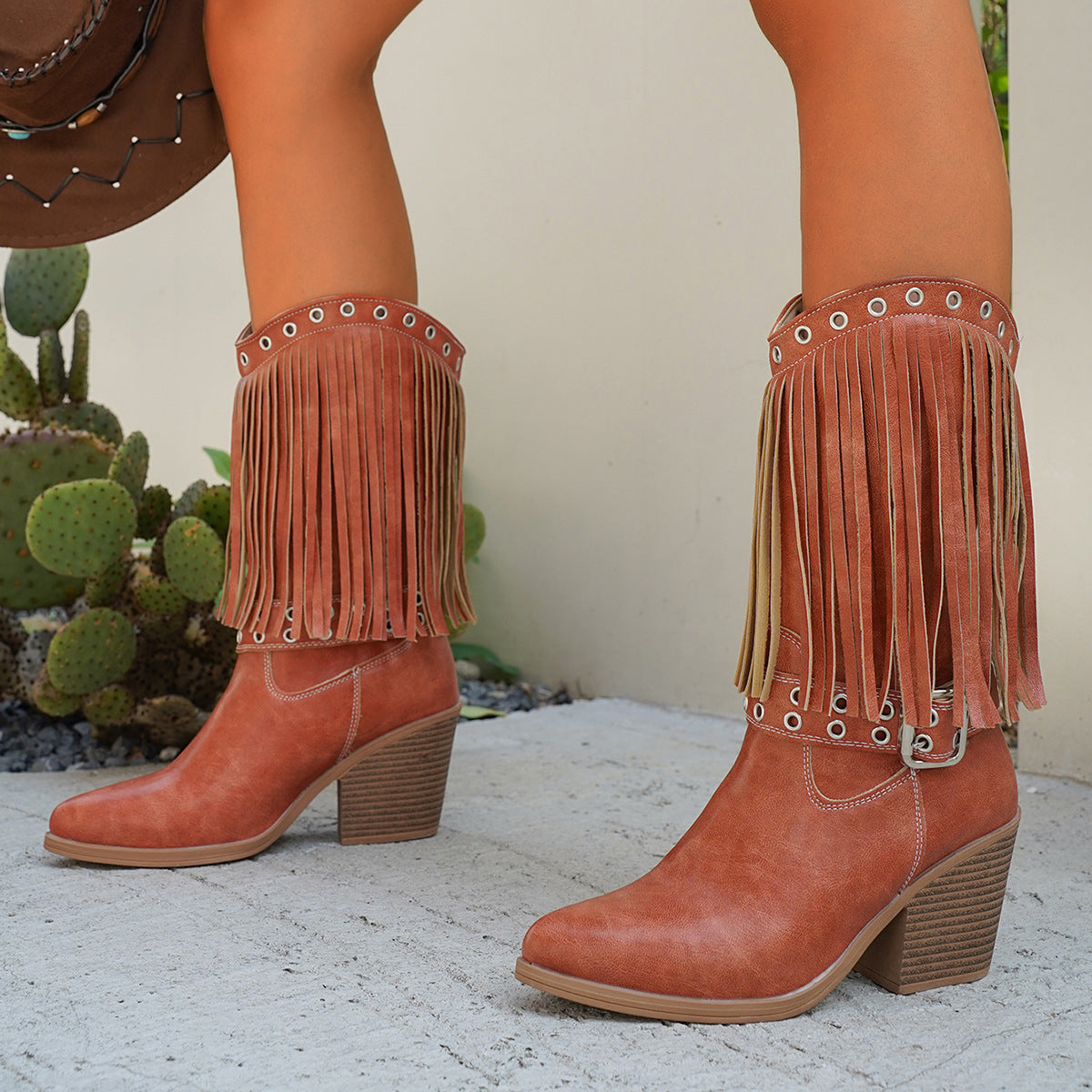 These tall boots with a pointed toe, square heel, and subtle metallic details combine comfort with a striking tassel accent — ideal for autumn and winter.