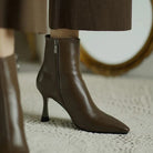 Refined pair of sharp pointy toe boots with a stiletto heel, featuring a side zipper for easy wear.