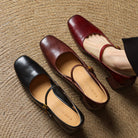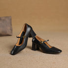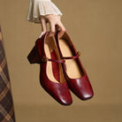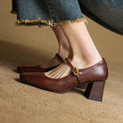 A modern square toe and a sleek mary jane strap enhance the graceful profile of these pumps, balanced by a sturdy block heel for added comfort and luxury.