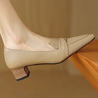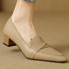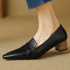 This stylish loafer pump with a pointed toe silhouette and a sleek twisted strap elevated by a stacked block heel.