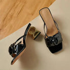 A blooming rose adds a romantic touch to this night-out ready sandal shaped in premium metallic set on a sculpted block heel.