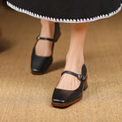 Smooth, richly-grained genuine shapes this classic square-toe pump, complete with a sleek mary jane strap and a subtly elevated square heel.