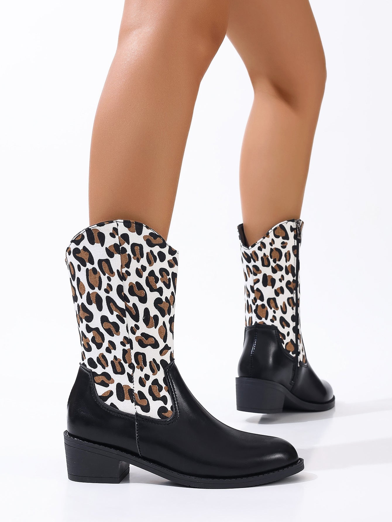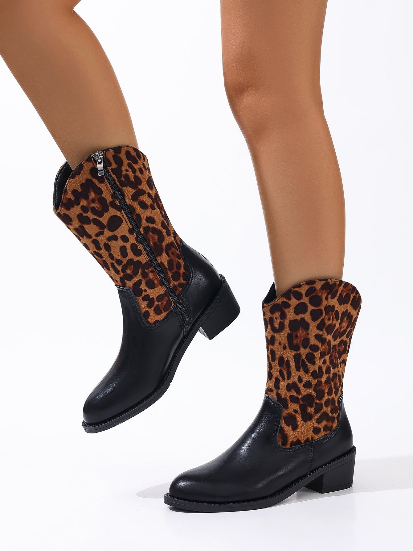 These mid-high boots with a leopard pattern and sturdy heel combine a bold look with everyday comfort. Perfect for autumn and winter, whether casual or chic.