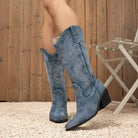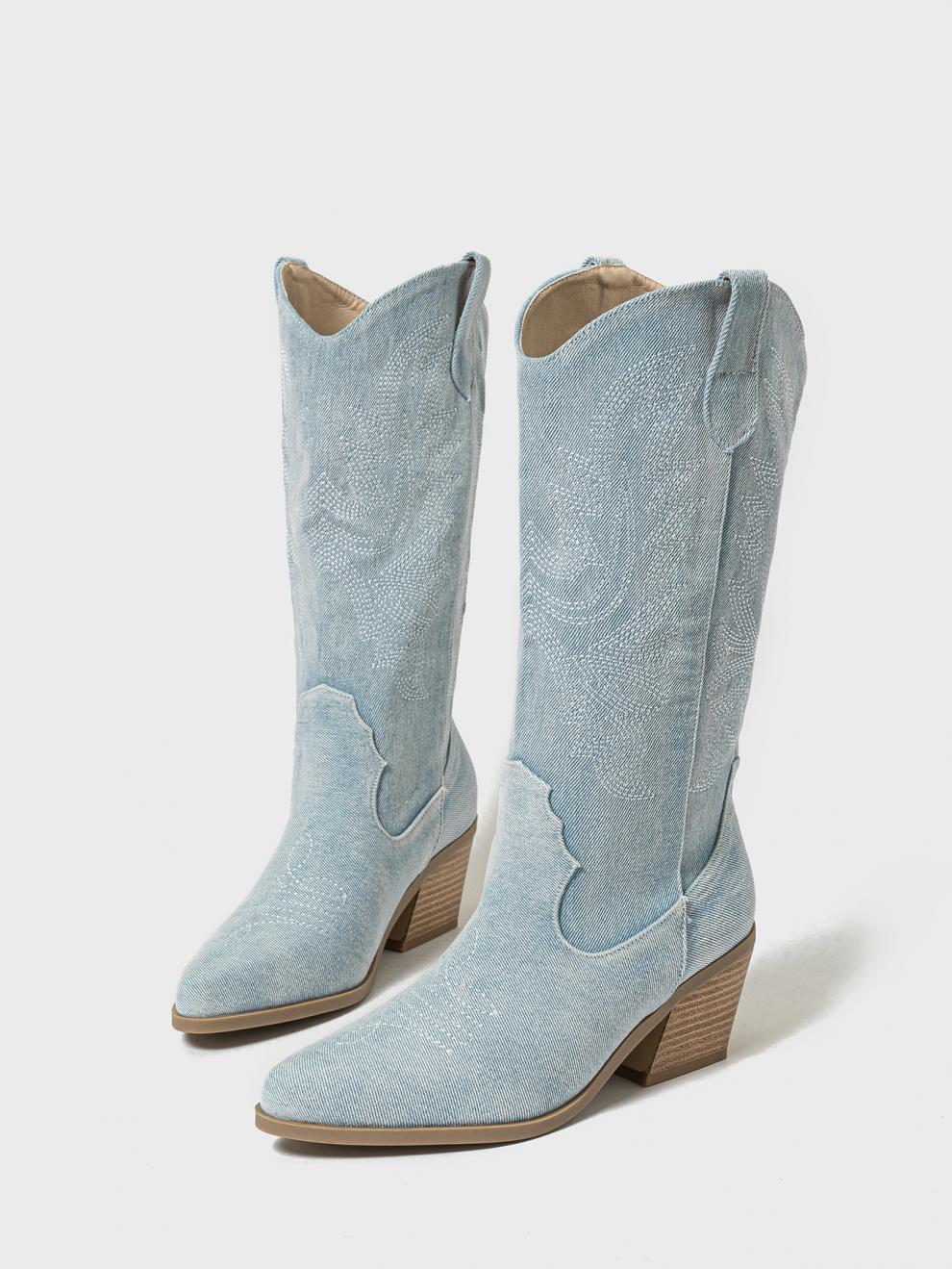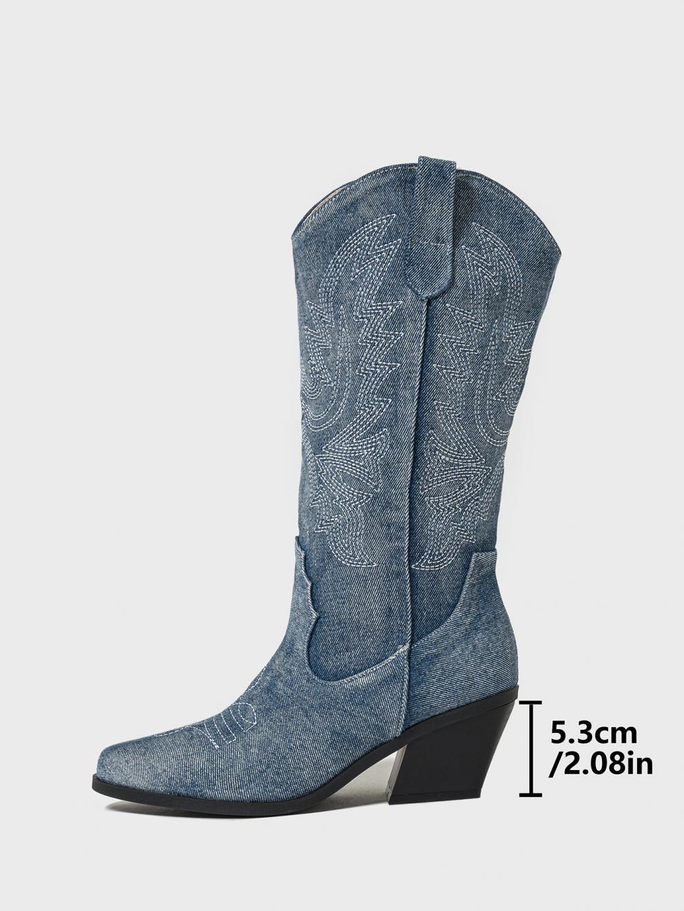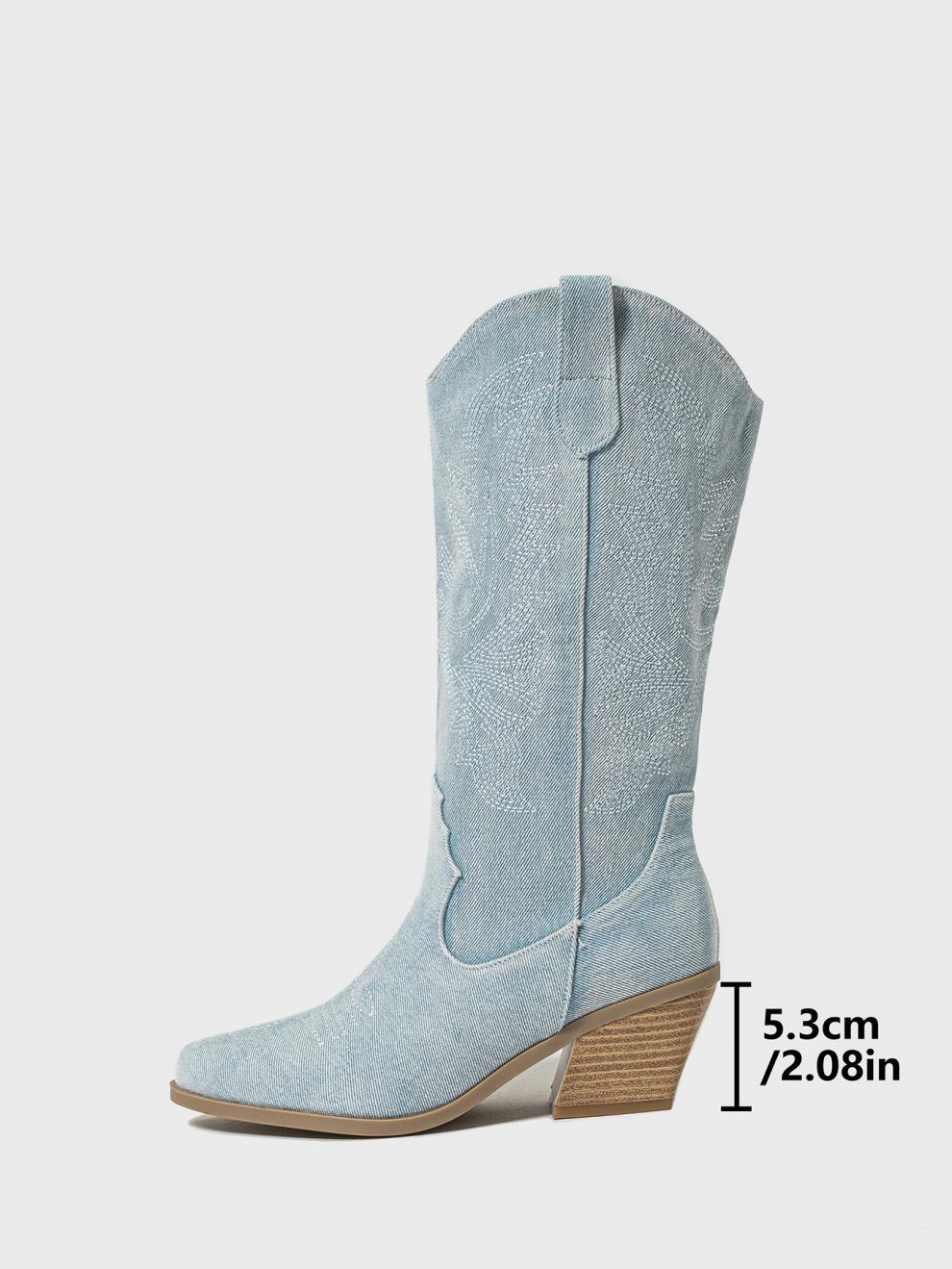 Mid-calf boots with a pointed toe, embroidered details, and block heel — stylish with both jeans and dresses.