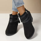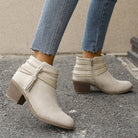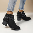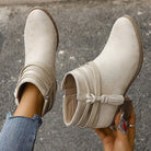 These mid-calf boots feature a pointed toe, sturdy high heel, and subtle cut-out detailing — stylish and versatile for the season.