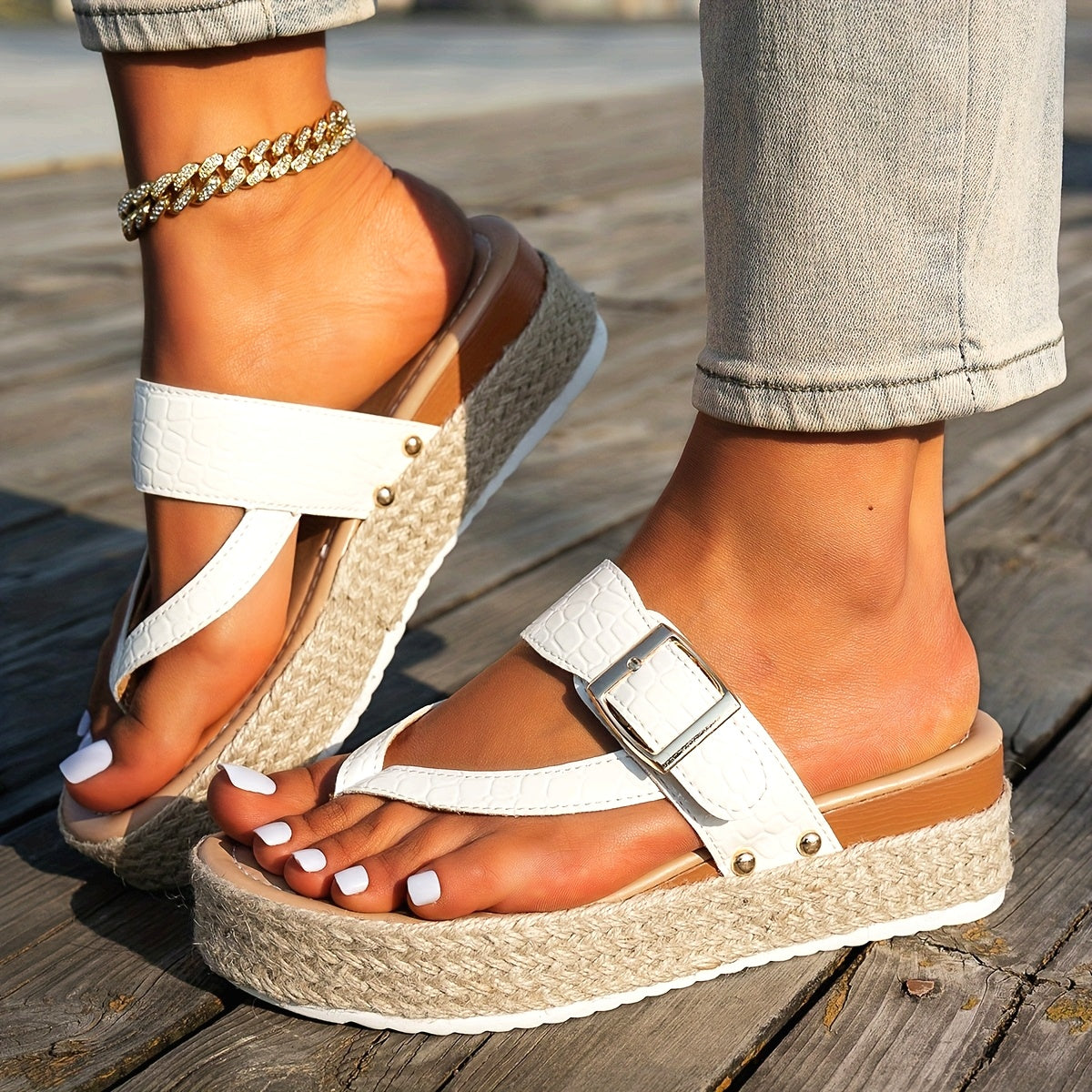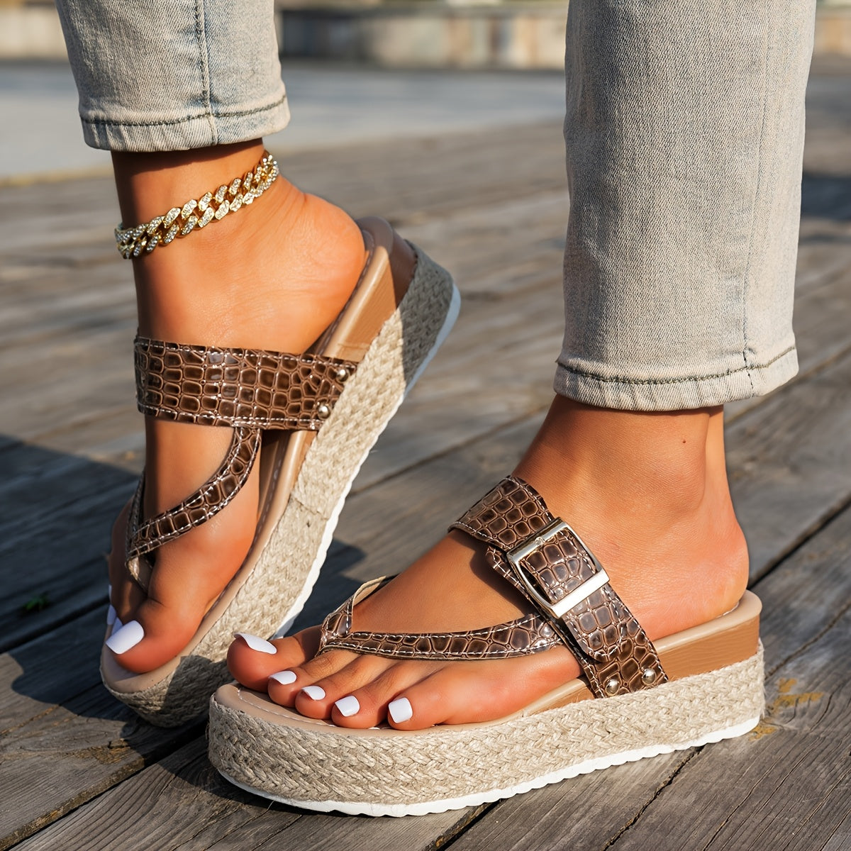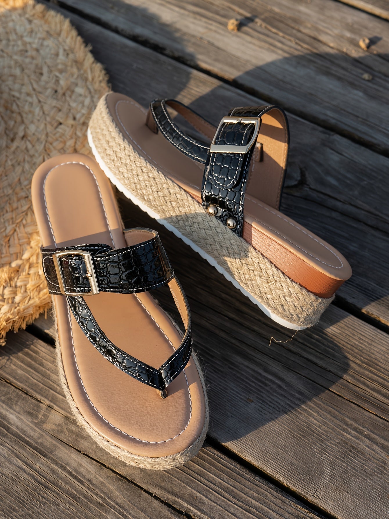 Step into effortless elevation with the Coastal Stitch Platform Sandals. Featuring croc-embossed vegan leather, a polished buckle strap, and a braided jute-wrapped sole, these sandals merge rustic texture with clean urban lines. Whether styled with light denim or flowing linen, they balance breezy comfort and refined detail in one lifted silhouette.