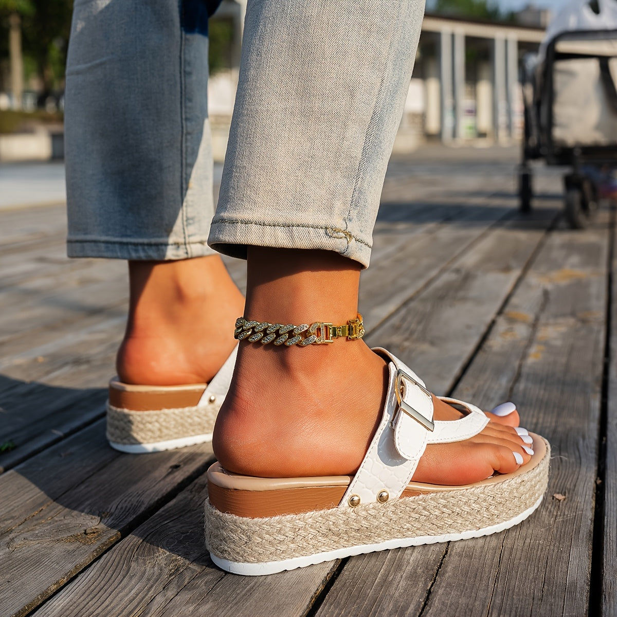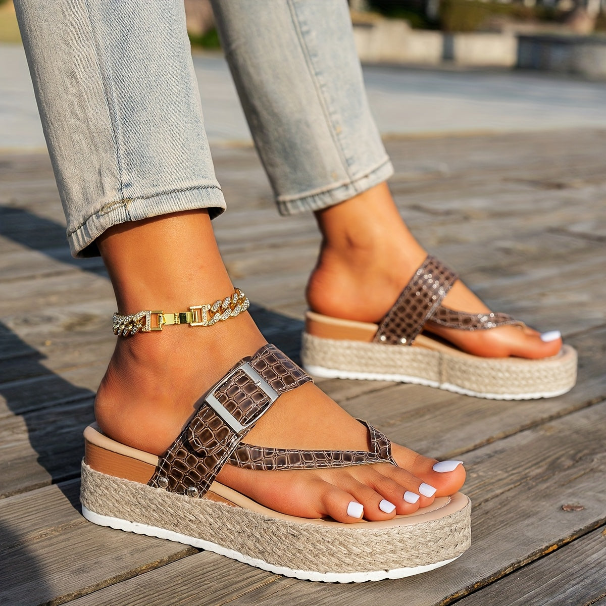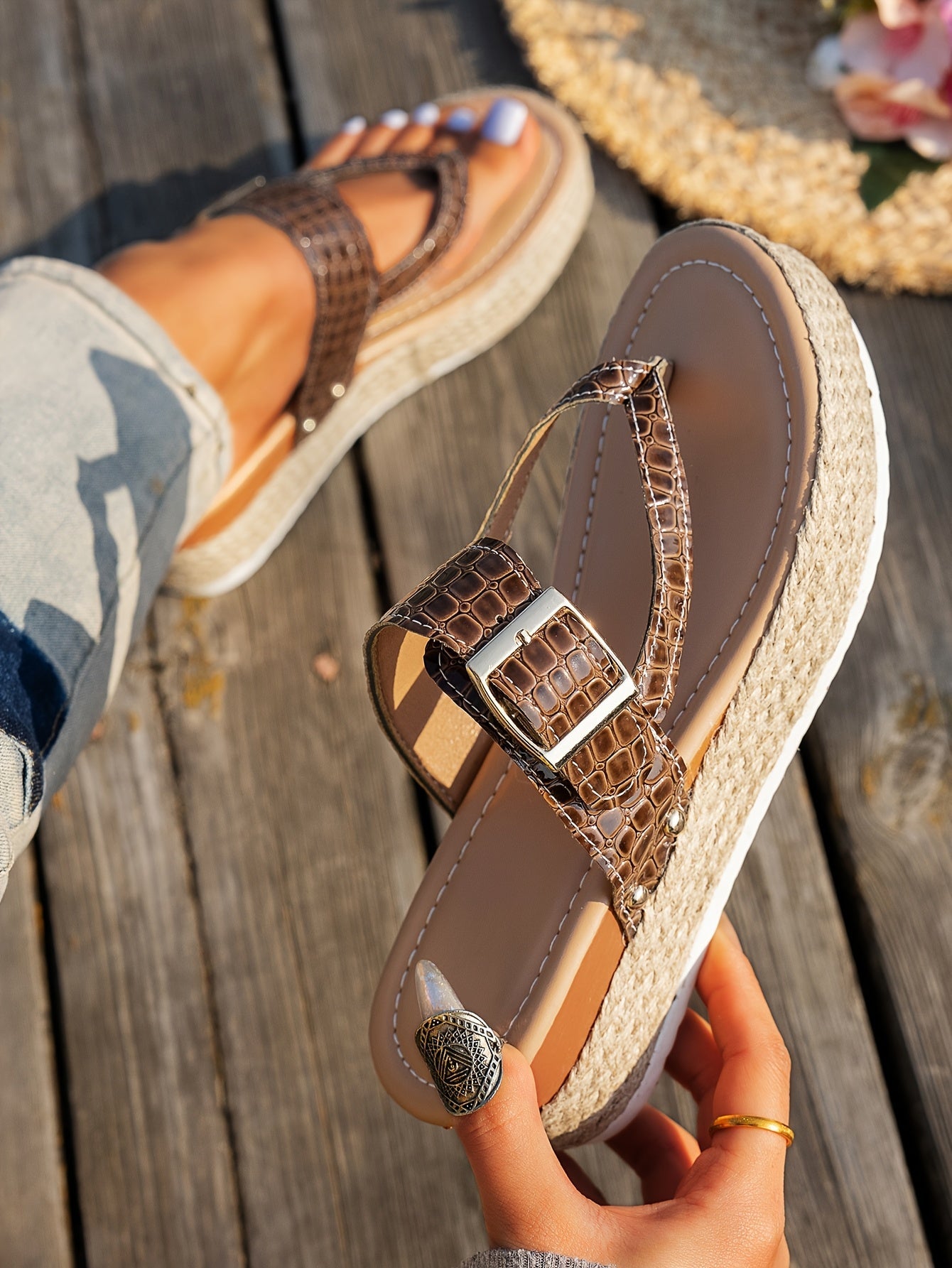 Step into effortless elevation with the Coastal Stitch Platform Sandals. Featuring croc-embossed vegan leather, a polished buckle strap, and a braided jute-wrapped sole, these sandals merge rustic texture with clean urban lines. Whether styled with light denim or flowing linen, they balance breezy comfort and refined detail in one lifted silhouette.