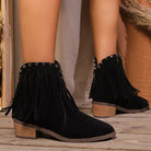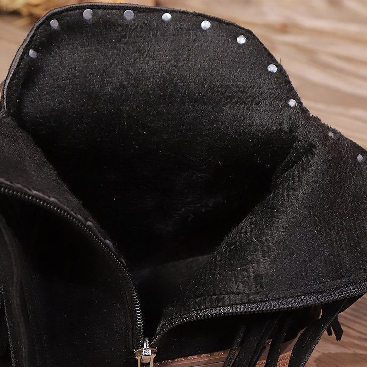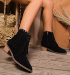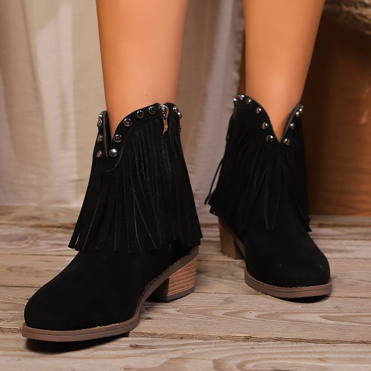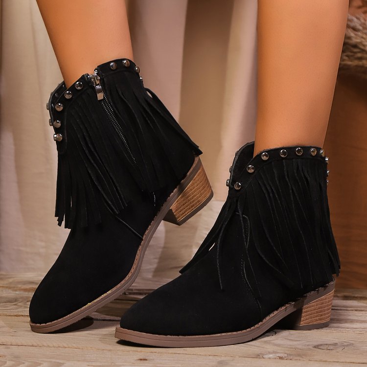 These low suede-look boots with playful fringes and a sturdy block heel add a touch of boho charm to any outfit — ideal for chilly days.