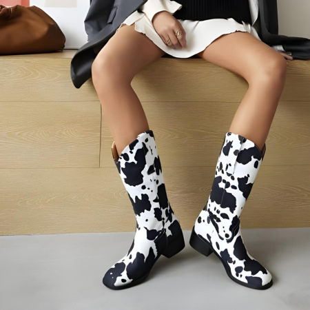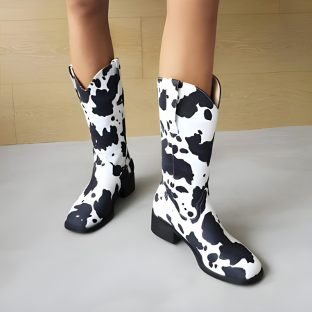 These tall boots with a square toe, contrasting colors, and chunky heel bring a strong western-inspired look. Perfect for autumn, winter, and spring.