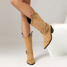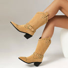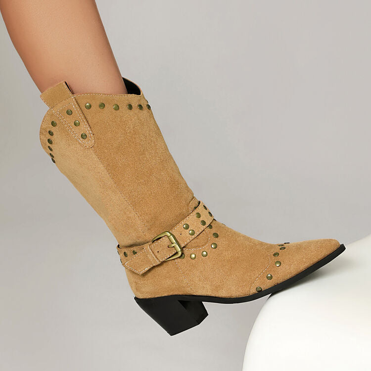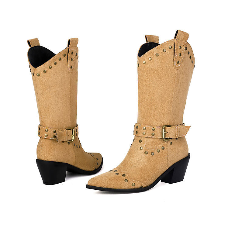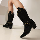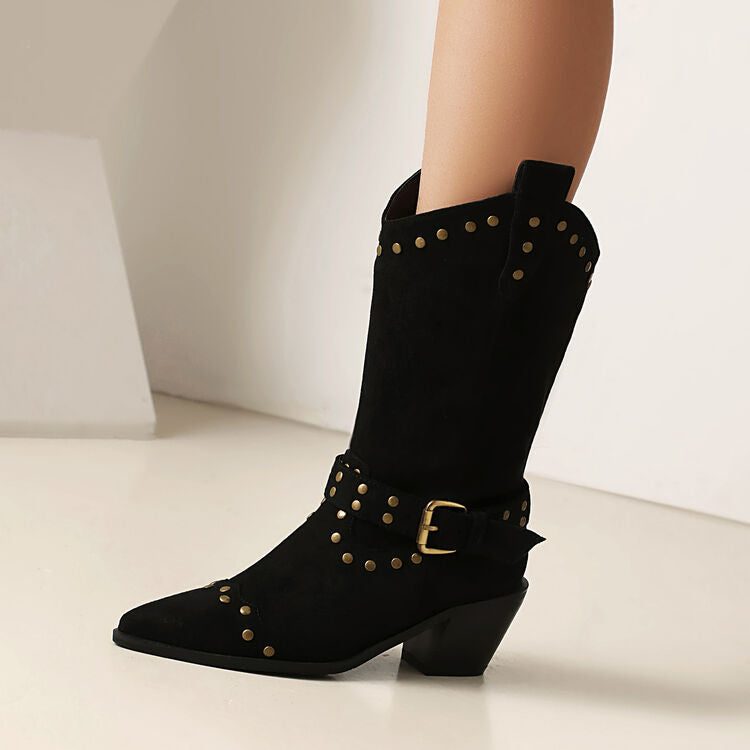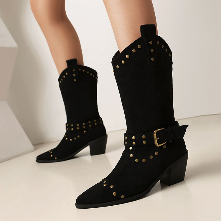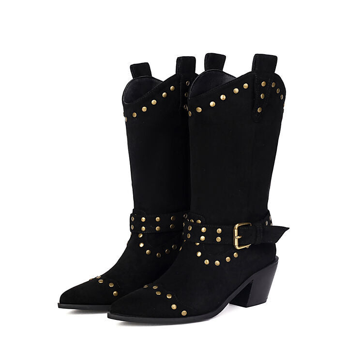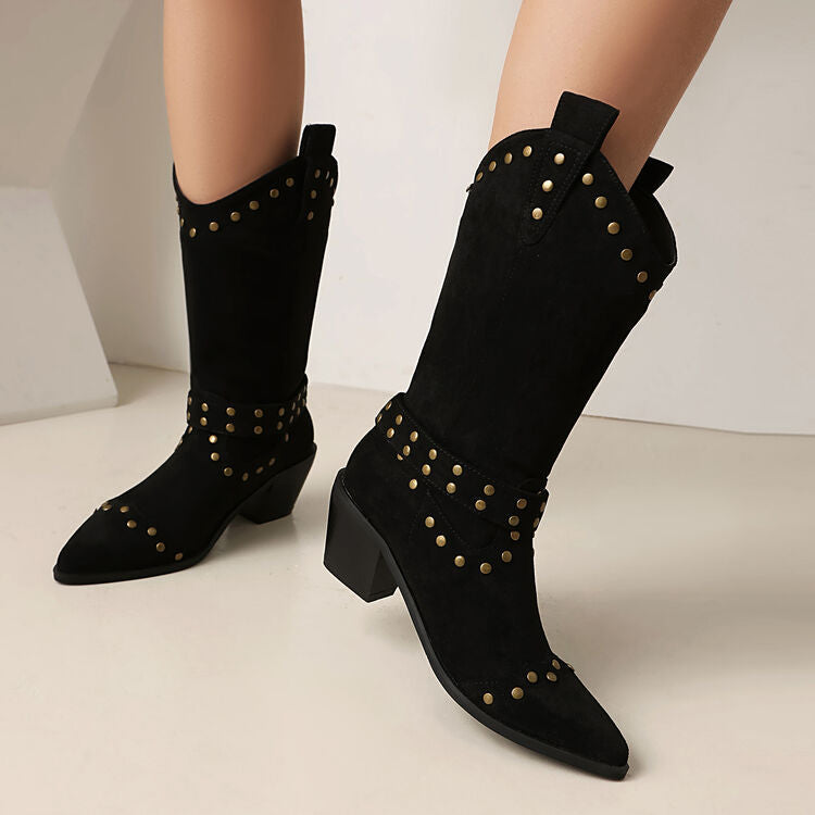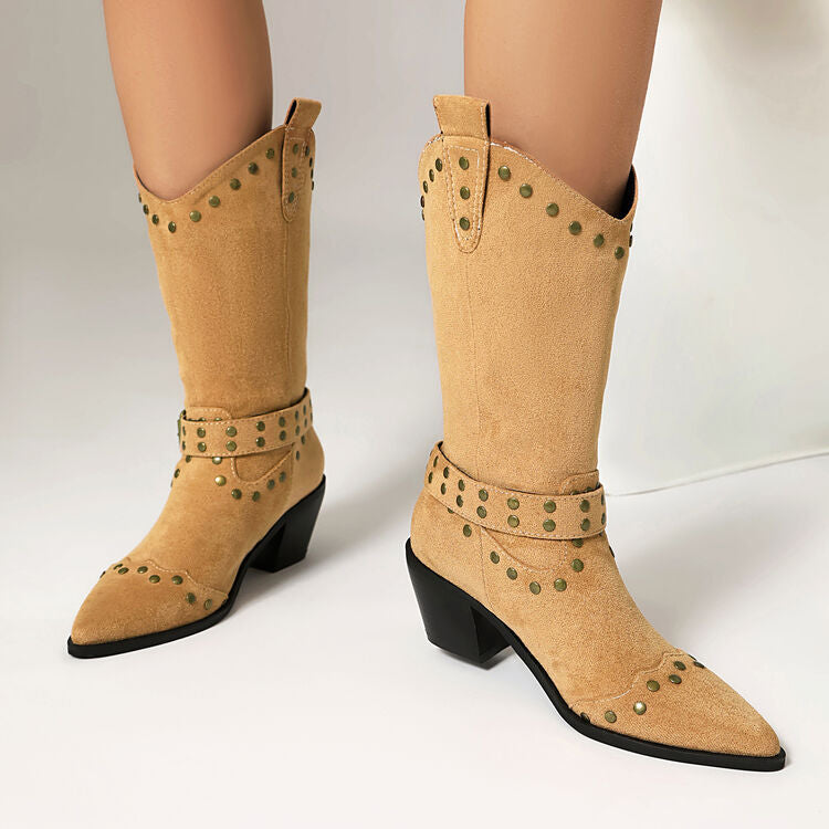 These mid-calf boots with subtle studs and a sturdy block heel add an elegant yet edgy touch to your outfit. Perfect for autumn and winter.