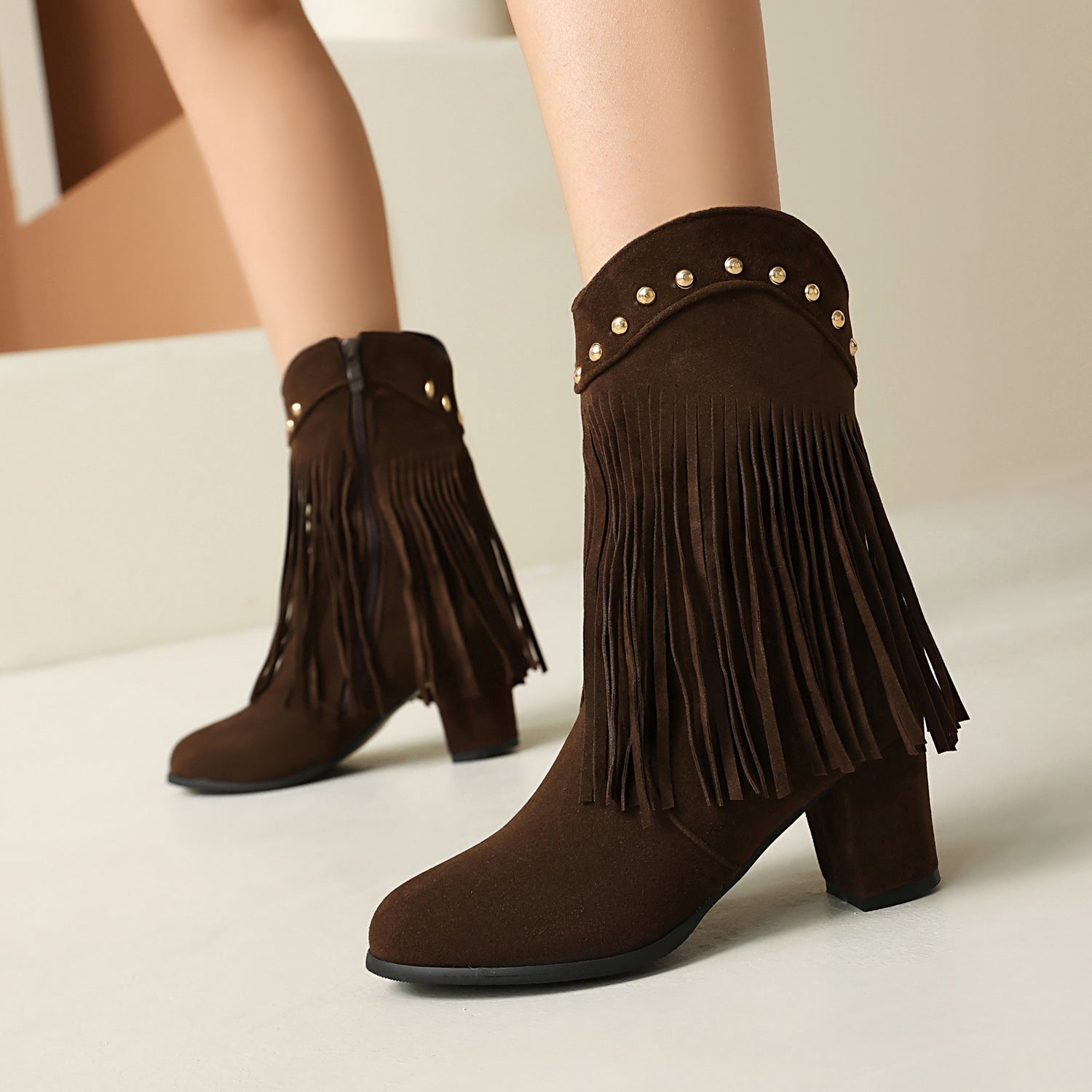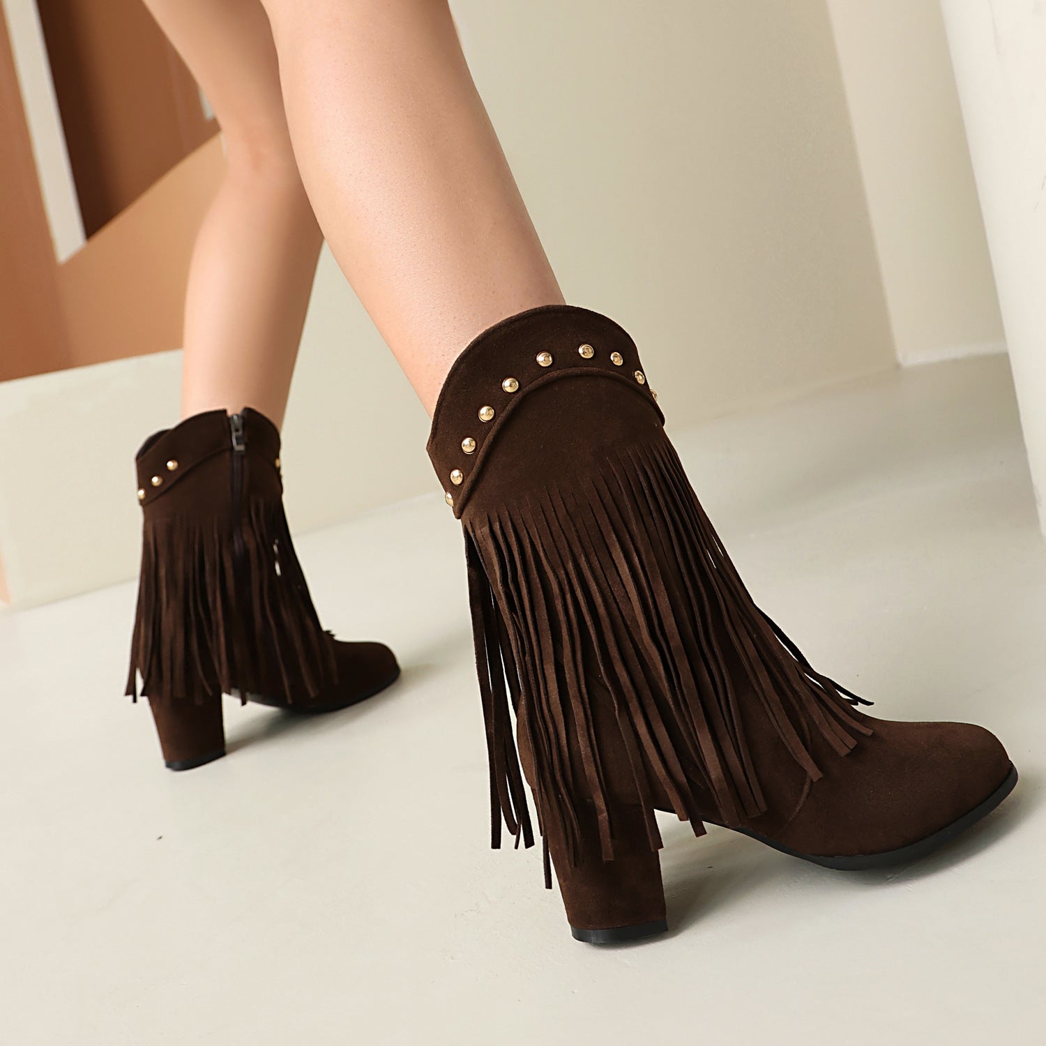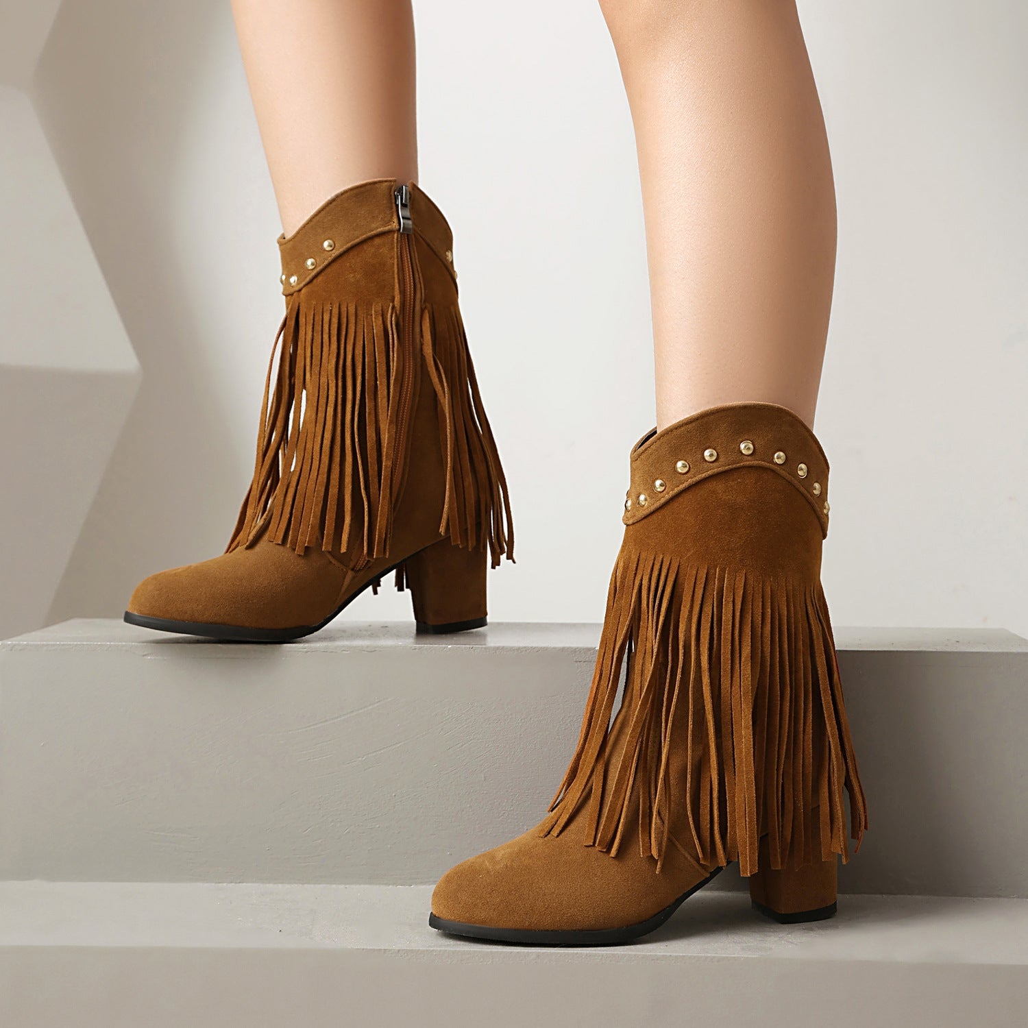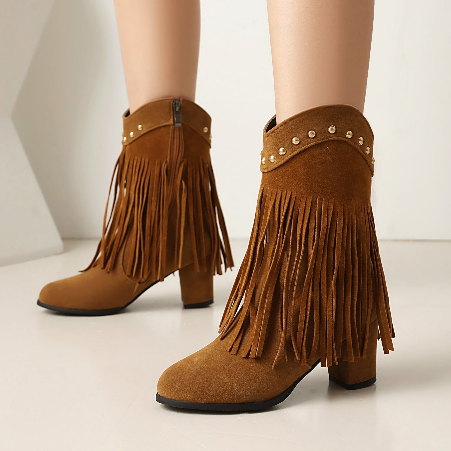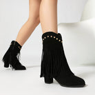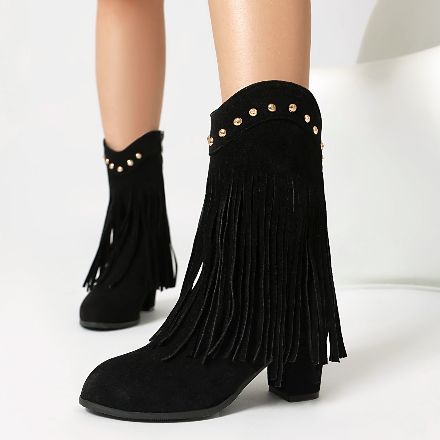 These low boots with fringes, bold studs, and a chunky heel elevate any outfit. Perfect for autumn and winter.