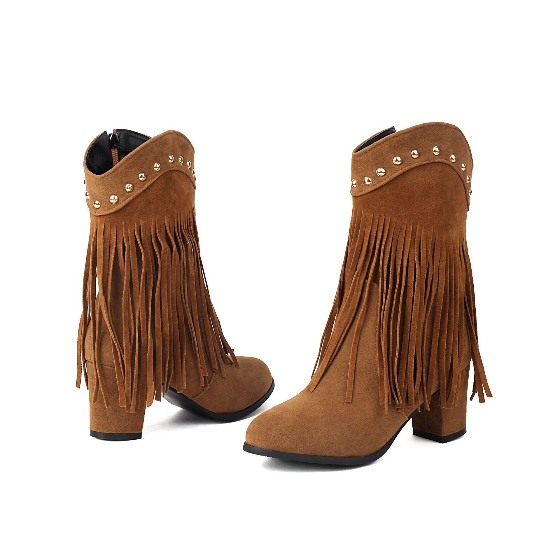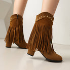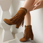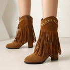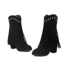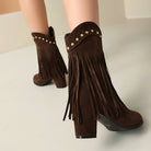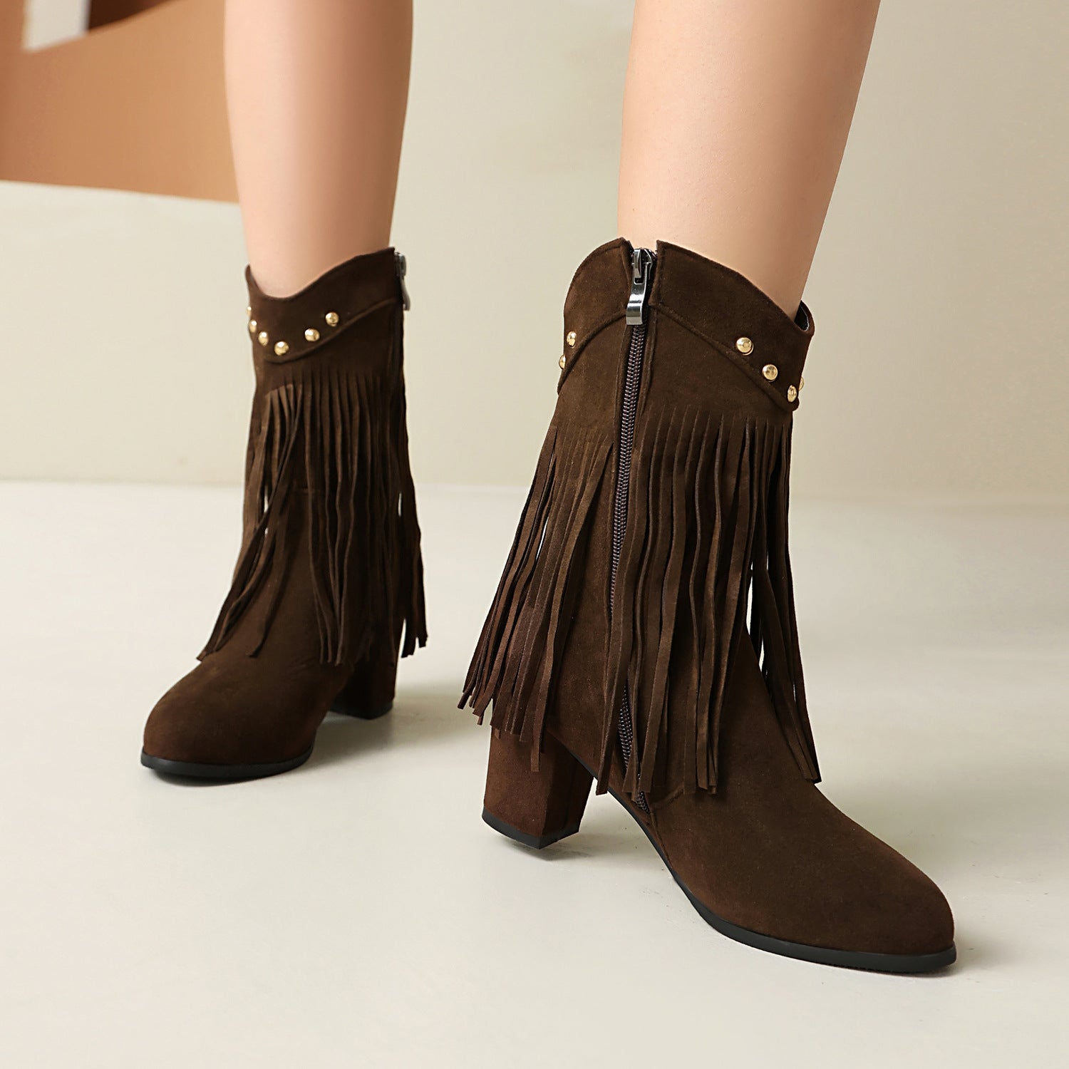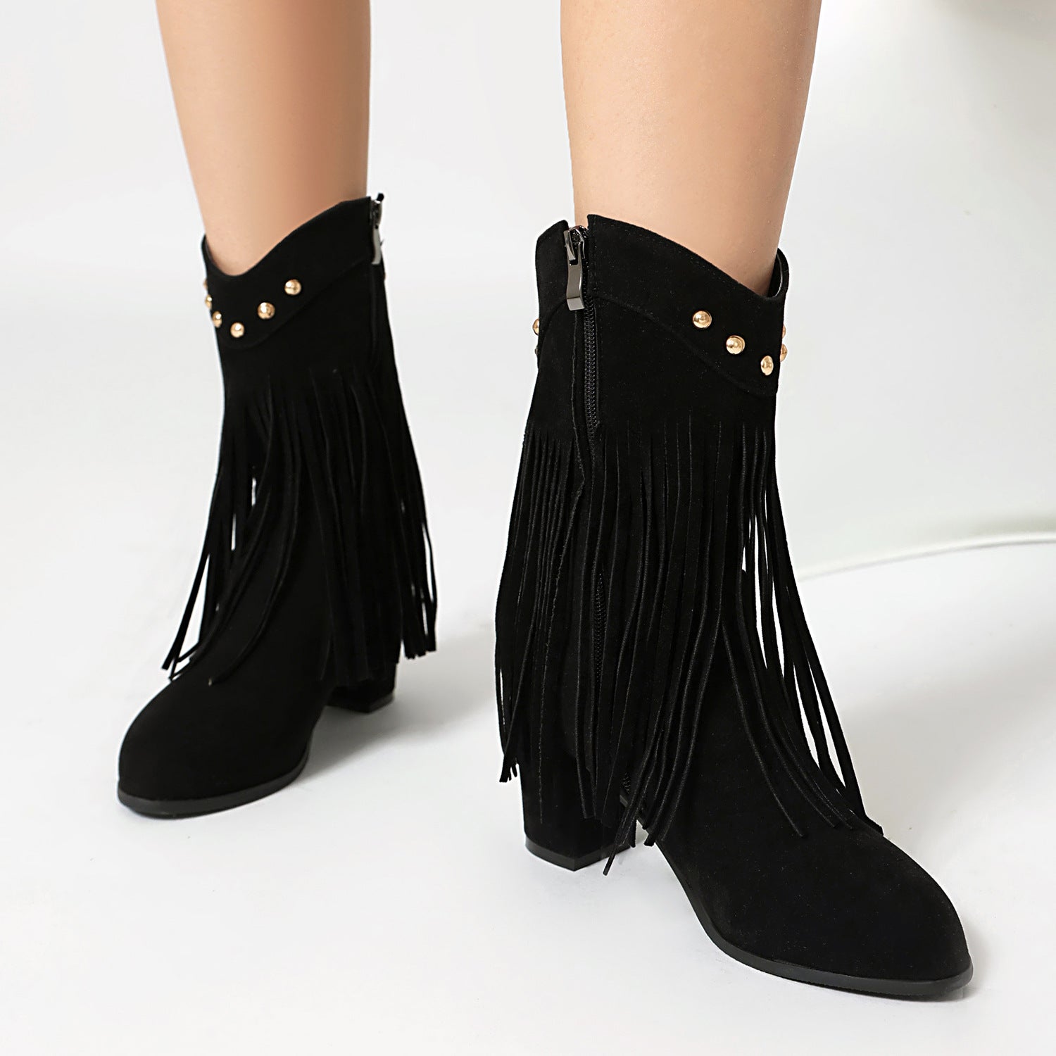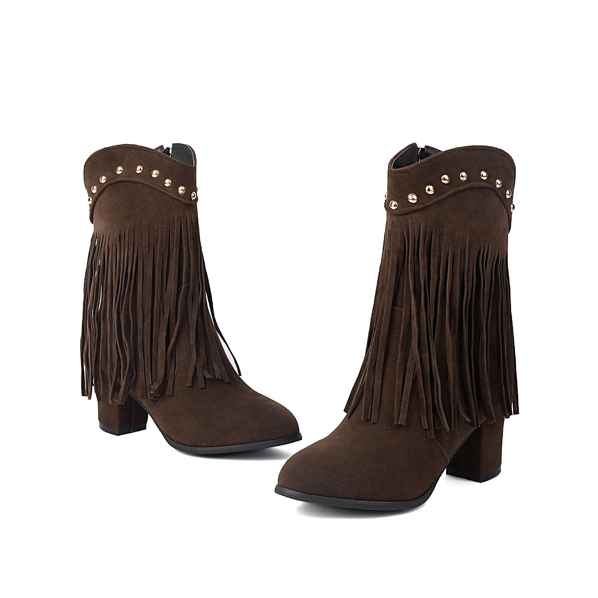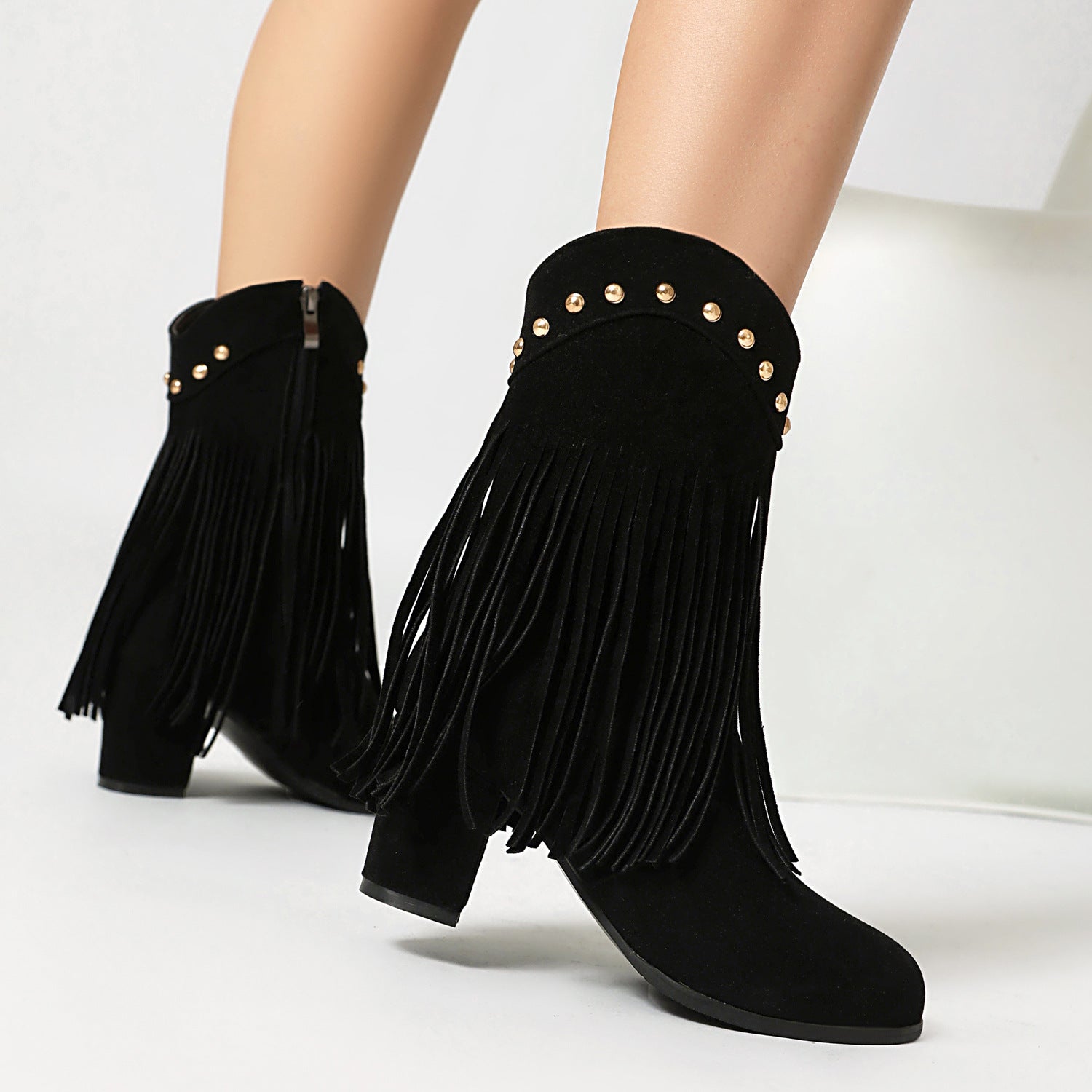 These low boots with fringes, bold studs, and a chunky heel elevate any outfit. Perfect for autumn and winter.
