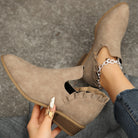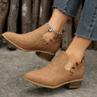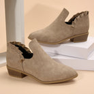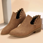 These low boots combine a sleek design with a feminine ruffle accent. The suede-look finish and low heel offer both comfort and an elegant touch.