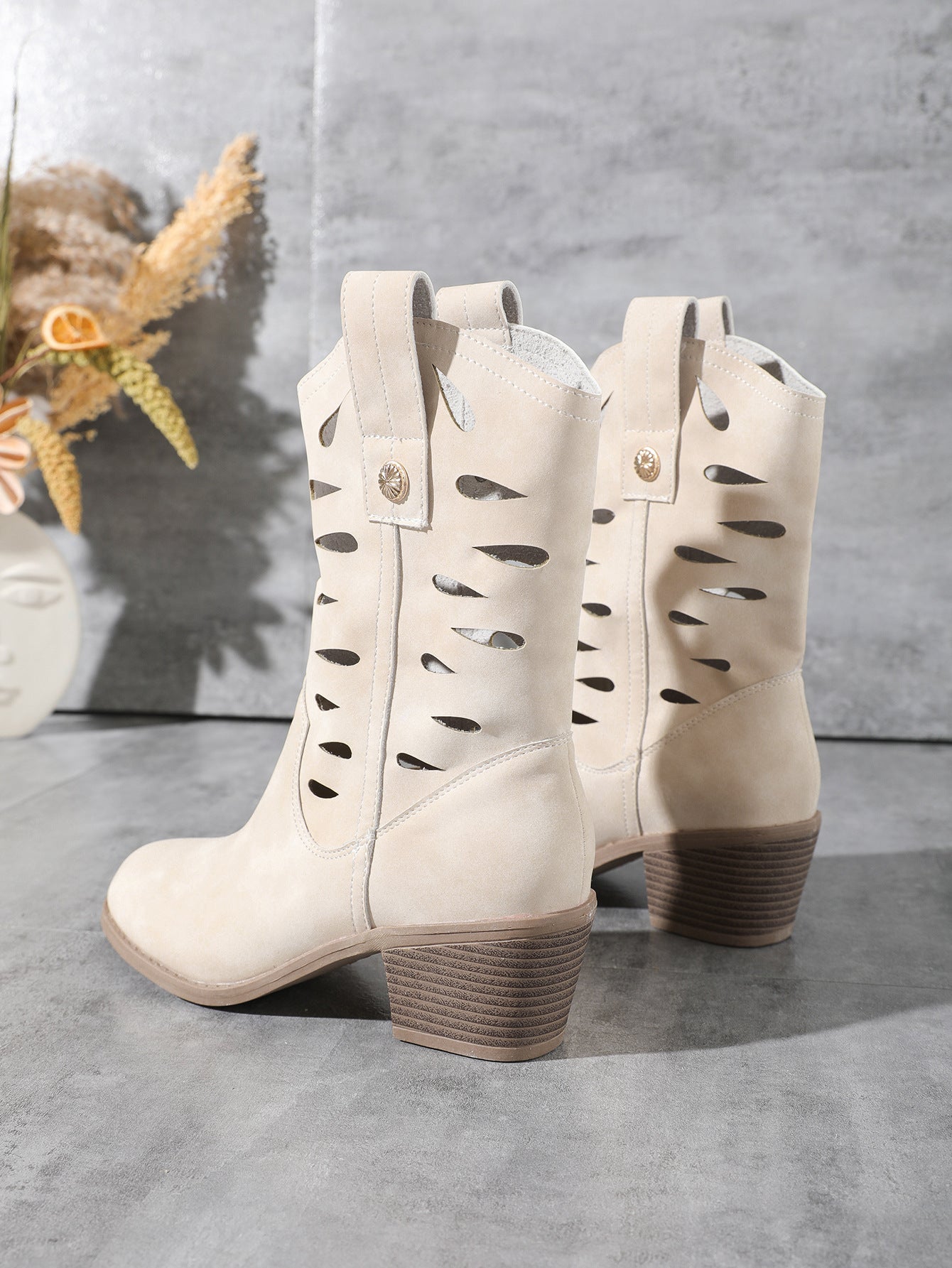 These mid-calf cowboy boots with a pointed toe, V-cut design, and sturdy block heel give you a bold yet elegant look. Perfect for autumn and winter.