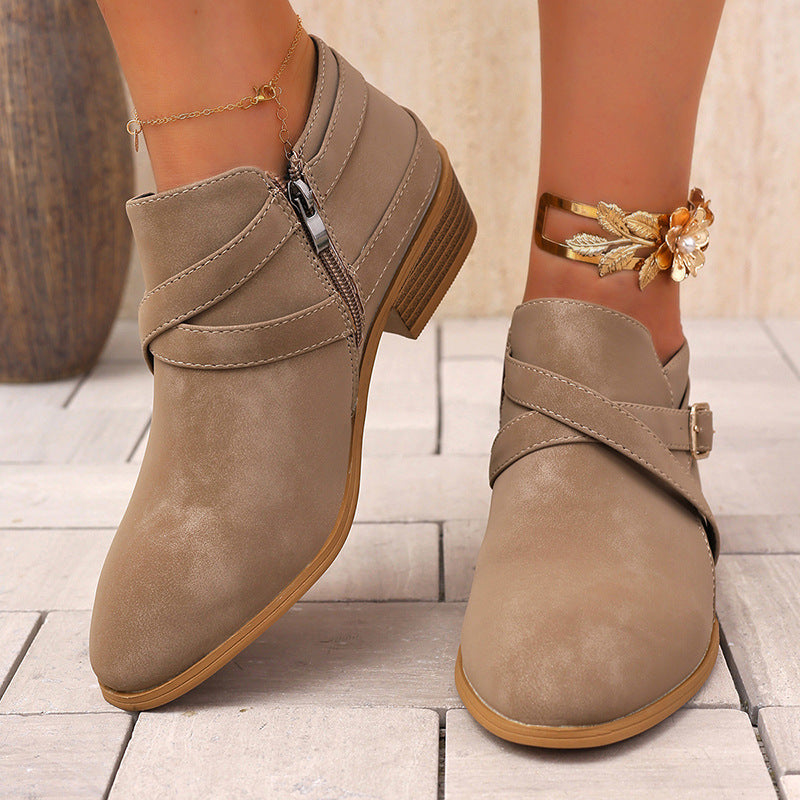 These suede-look ankle boots with a pointed toe and sturdy block heel add an elegant, vintage touch to any outfit. Perfect for autumn and winter.
